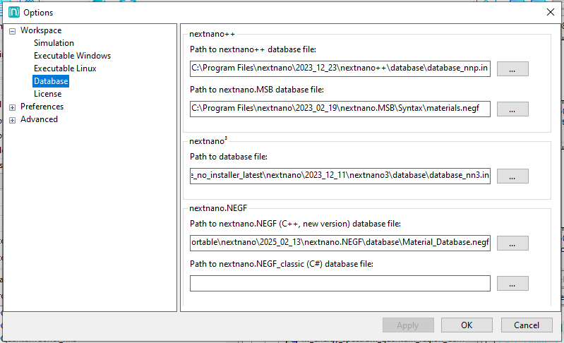Path to the databases are prefilled at app start. If specific versions of the nextnano tools are used and downloaded separately from nextnanomat, then paths need to be adjusted manually.
