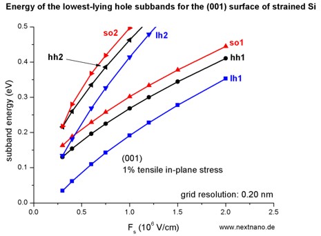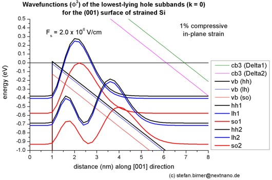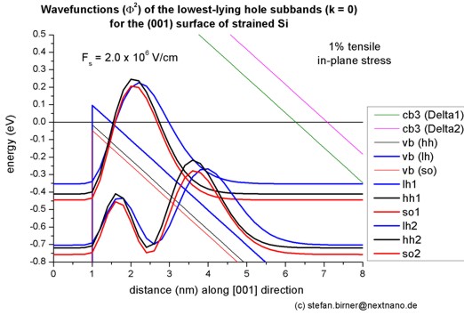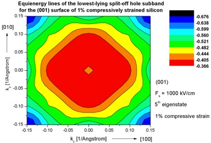silicon calculated using a strain dependent 6-band k.p Hamitonian. Only one spin