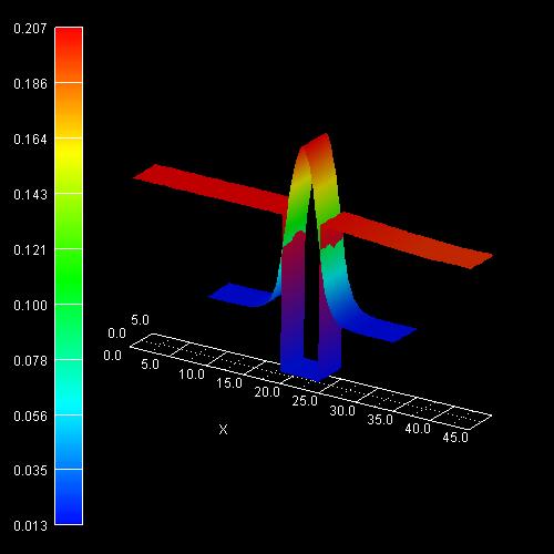 In 2D, the simulated structure is 45 nm long and 5 nm wide (y axis). Along the y